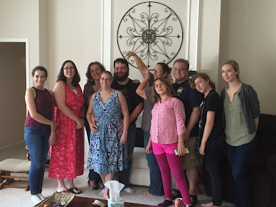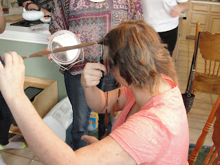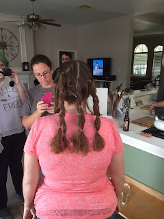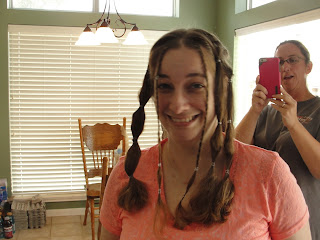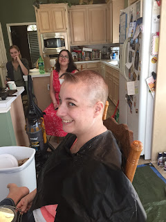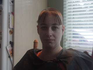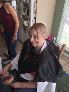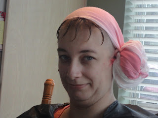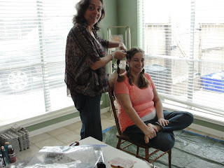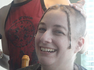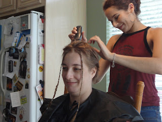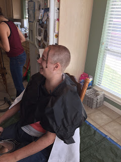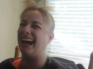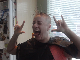 Saturday was the next step in my journey with cancer, baldness. And because I refused to be upset about this I decided to have a party. We had so much fun it wasn't funny. From dreadlock looking ponytails to a really bad 90's shag complete with a want to be whale tail, from bad boy band with spiked front to a total buzz job. We laughed and laughed. They got inventive with wax and gel. Then I had to shower off because their was hair everywhere. Here is the process in photos. Hope you enjoy.